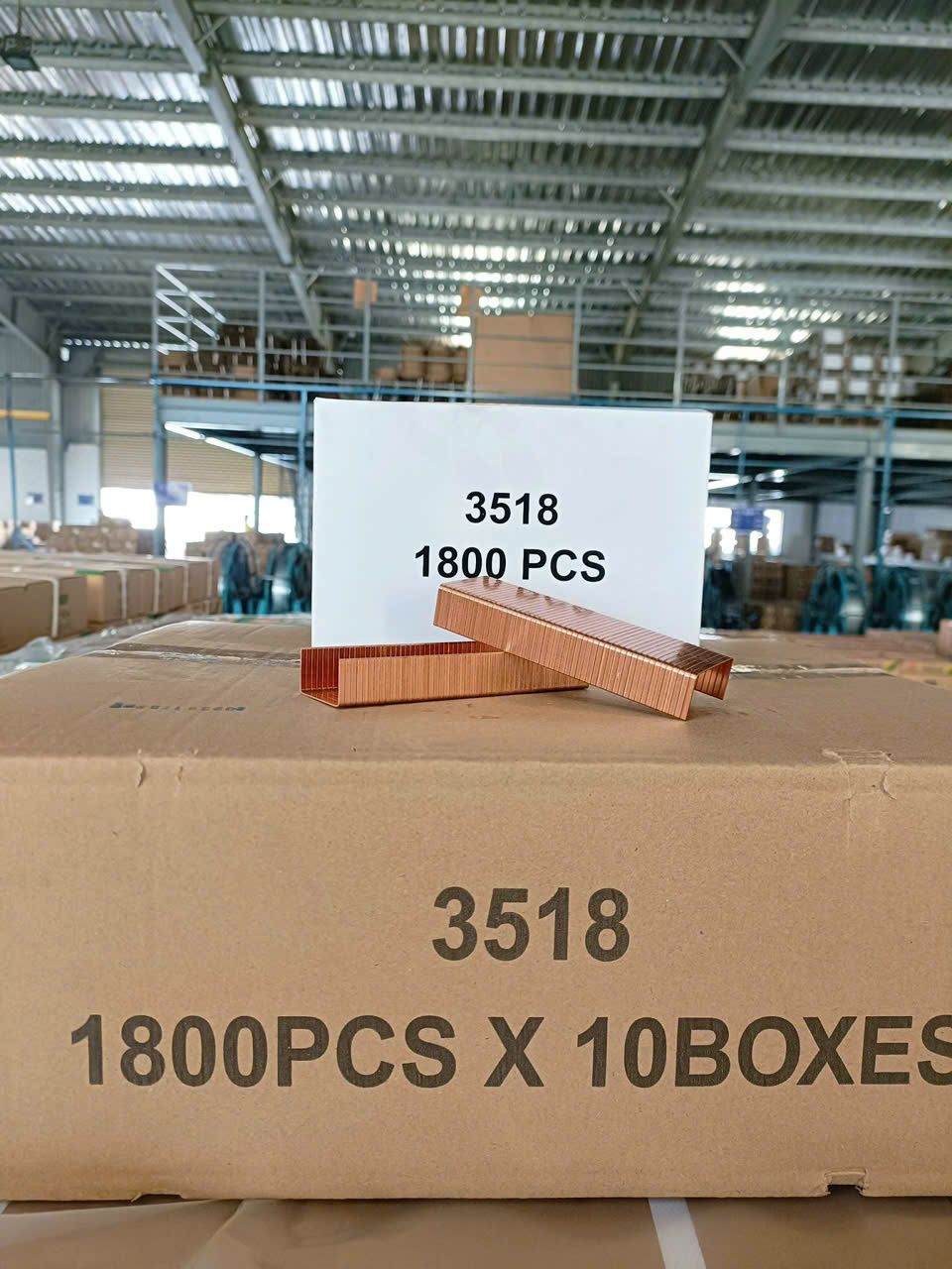 Khả năng cố định chắc chắn: Với thiết kế dạng chữ U và chiều dài 18mm, đinh 3518 có thể xuyên qua các lớp carton dày, đảm bảo thùng hàng không bị bung trong quá trình vận chuyển.